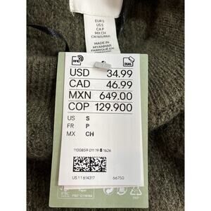 This H&M oversized green knit sweater in women's size S is a stylish and comfortable addition to any wardrobe. Made of polyester and acrylic material, this pullover sweater features long sleeves and a regular fit, perfect for everyday wear. The machine washable fabric makes it easy to care for, while the oversized design adds a trendy and relaxed touch to the classic sweater style. Perfect for layering in cool weather, this H&M sweater is a versatile and fashionable choice for women.