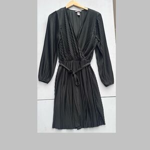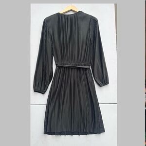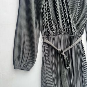 Narrow, elasticated seam at waist with removable tie belt. Raw-edge hem.