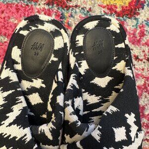 Platform sandals in woven fabric. Wide, padded crossover foot straps and patterned soles.