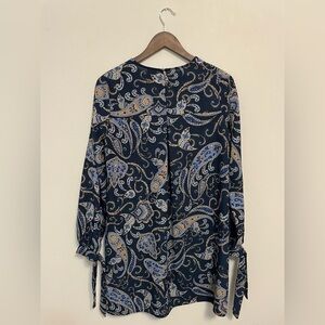 Stylish H&M top with paisley pattern. Features blue and gold tones. Tie wrist closure and eyelet back closure features. Size 6