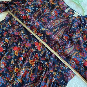 Elevate your wardrobe with this stunning H&M paisley peplum ruffle long sleeve blouse, blending boho chic with timeless elegance. Featuring a whimsical paisley print and delicate ruffle details, this blouse exudes sophistication and charm.