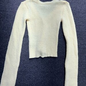 Lightweight ribbed knit cardigan. V-neck with button-front closure. Long sleeves and fitted silhouette. Soft pale yellow color. Versatile layering piece.