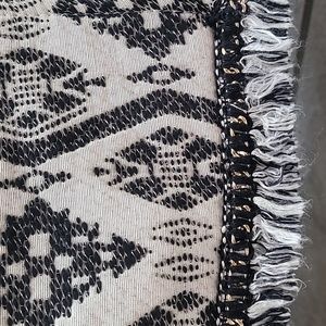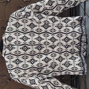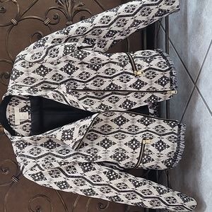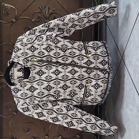Off white and black patterned H&M blazer with pockets. The blazer has gold zippers and a metal chain with fringe detail at the bottom.
