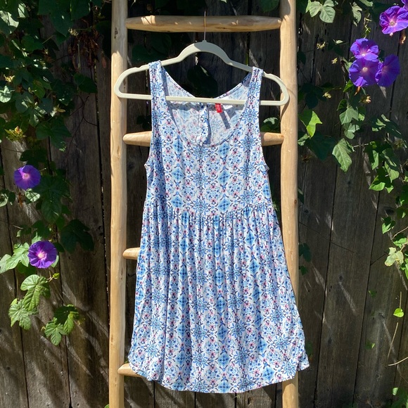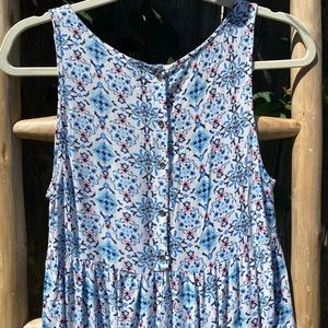 Cute blue and pink patterned summer dress W/ small gray buttons down the back Size 6 100% Rayon
