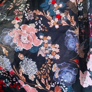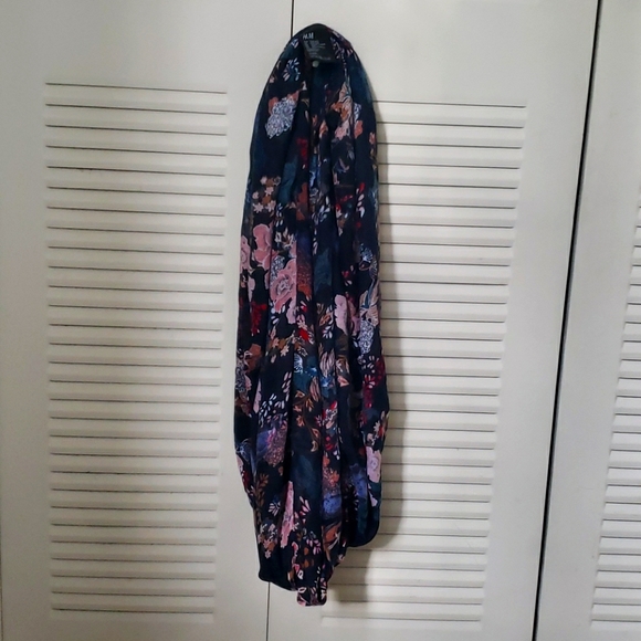 Dark blue background, floral pattern. Color palette: Pinks, browns, reds, blues, whites, blue/green. One size. Great condition, really beautiful scarf. Pretty thick so provides a really full look & tons of warmth!
