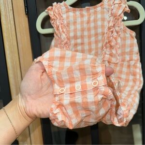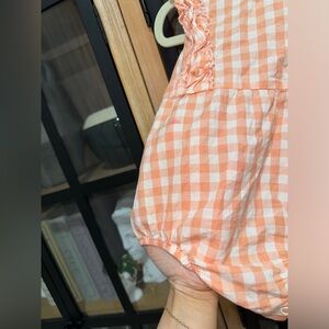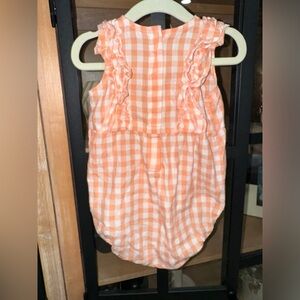 Adorable peach gingham romper. Features ruffled sleeves. Snap closure for easy dressing.