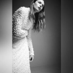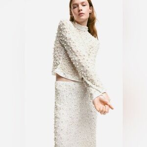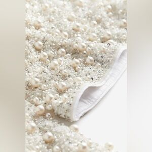 Short, fitted top embellished with shimmering sequins, glass beads, and pearlescent plastic beads. Stand-up collar, concealed zipper at back of neck hook-and-eye fasteners, and long sleeves. Unlined.