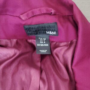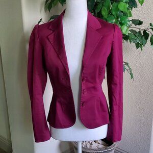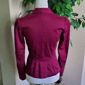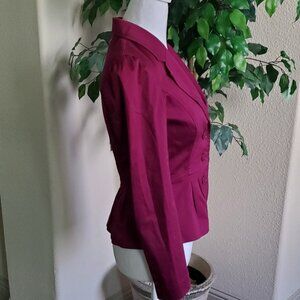 Pleated waist peplum blazer with three-button closure, reinforced shoulders, and button detail on the sleeves. Fuschia/Purple color is bright and playful. It is a little more purple than the camera captured. Fully-lined. 100% Polyester. Size 4.