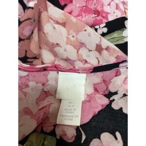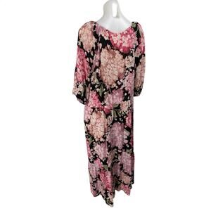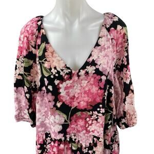 H&M Pink Black Floral Short Puff Sleeve V Neck Tiered Maxi Swing Dress Size L