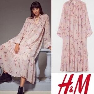 H&M Pink Floral Sheer Chiffon High Ruffle Neck Hippie Boho MIDI Length Dress SizeSmall