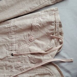 h&m pastel pink jacket. drawstring at waist. pocket at hips and one at arm. the "pockets" on chest are just decorative. this jacket looks good on everyone.