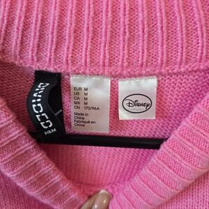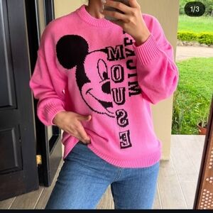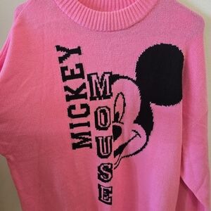 Bright pink sweater with Mickey Mouse design. Bold and playful style.