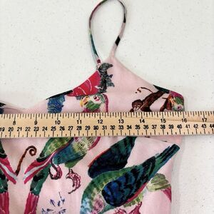 Features: H&M Women's Pink Pleated Jungle Print Midi Dress. Adjustable spaghetti straps. Lace Up Back. Tropical Print, Novelty animals like leopards, monkeys, parrots.