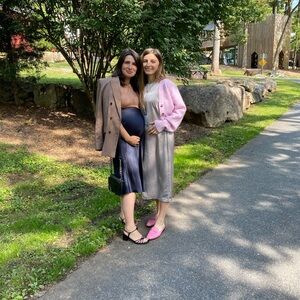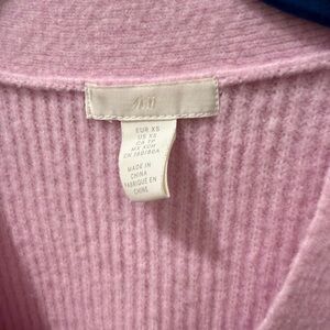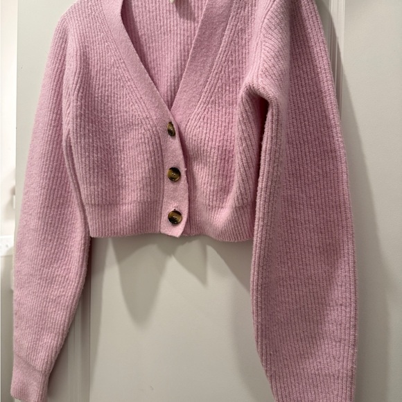 Chic pink cardigan with button closure. Soft ribbed texture. Ideal for layering.