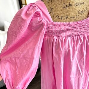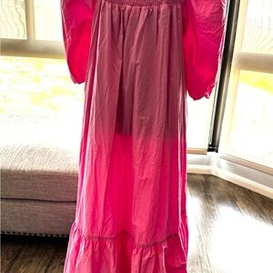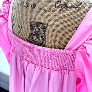 Chic pink dress with ruched details. Stylish and versatile.Very cute long dress puff sleeve a little damage in front but fixable great condition