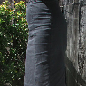 Selling a size 4 H&M Pinstripe skirt.  The pinstripe is very subtle; very small white lines.  Skirt is 23 inches long and features an inner polyester lining.  Back of skirt has 2 slits.  Fabric is 96% cotton,   3% spandex, and 1% polyester.   Skirt in good condition.