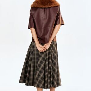 Loose-fit, ankle-length circle skirt in woven cotton. Brown Faux Leather Coated binding at waist, discreet side pockets, and a concealed zipper at one side with hook-and-eye fastener. Unlined.