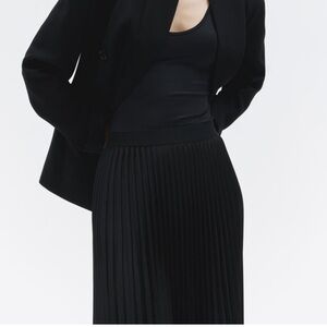 Calf-length, pleated skirt in woven fabric with a slight sheen. High waist, elasticized waistband, and overlocked hem. Unlined.