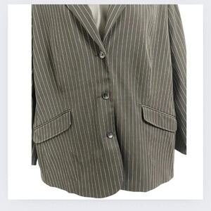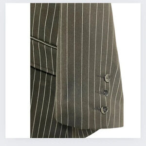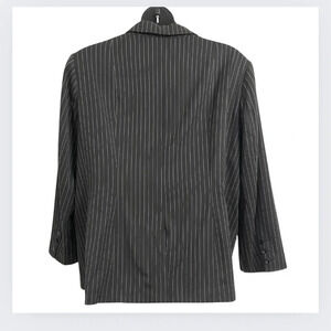 Fitted jacket in a pinstriped weave with notch lapels, three button at the front, flap front pockets and a single back vent. Lined.
