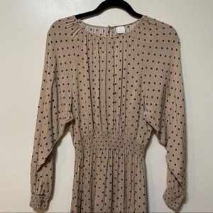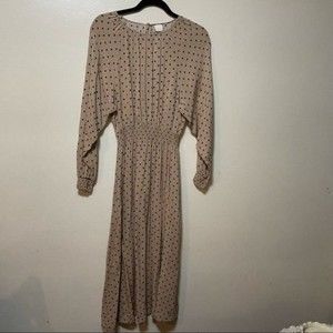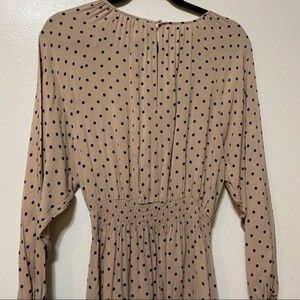 Stylish tan dress with black polka dots. Long sleeves and gathered waist. Perfect for any occasion.
