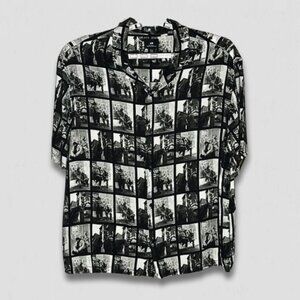 H&M Printed Resort Shirt Relaxed Fit Side-Slit Straight-Cut Hem Black/Gray sz XL
