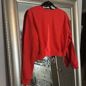 Bold coral sweatshirt with 'Printemps à Paris' text in white.