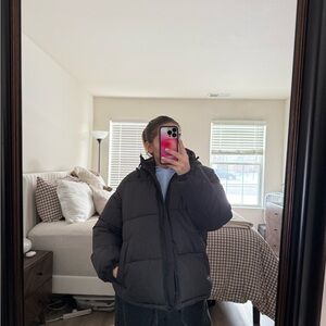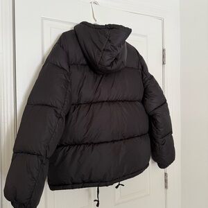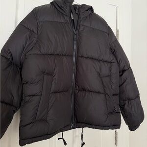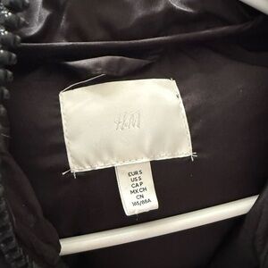 H&M black zip up hooded puffer jacket, size small, oversized fit! I usually wear a size medium and this fits perfectly with a hoodie underneath.