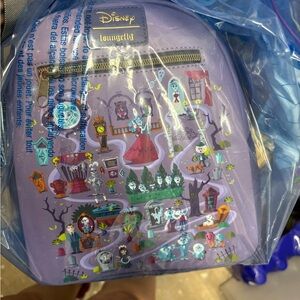 Stylish purple backpack from loungefly. Features sleek design and durable material. Cute haunted mansion print on the front.