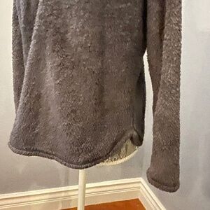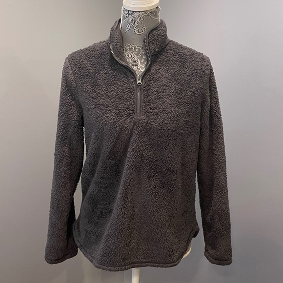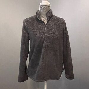 Dark grey faux shearling/teddy style quarter zip pullover.
