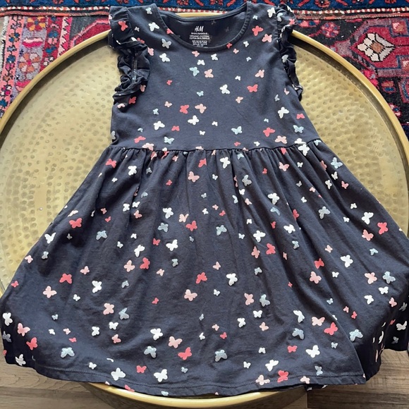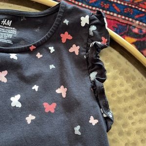 pink, white, silver, mauve butterfly print sleeveless ruffle detail, sleeve waist hem detail