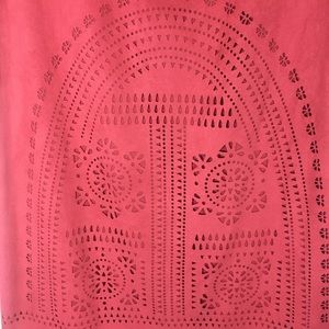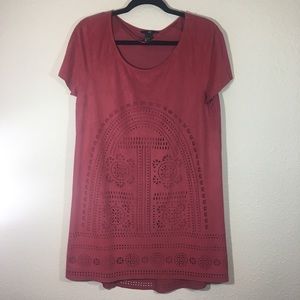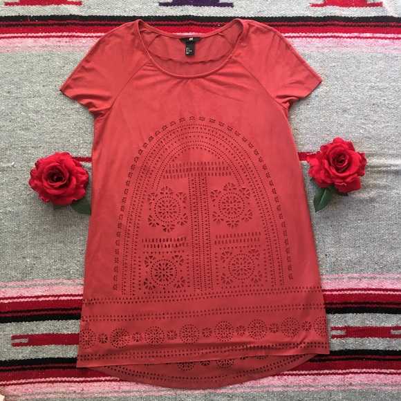 Rust colored dress by H&M. Intricate cutout details down center of dress and around hem. [46]