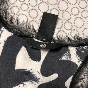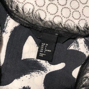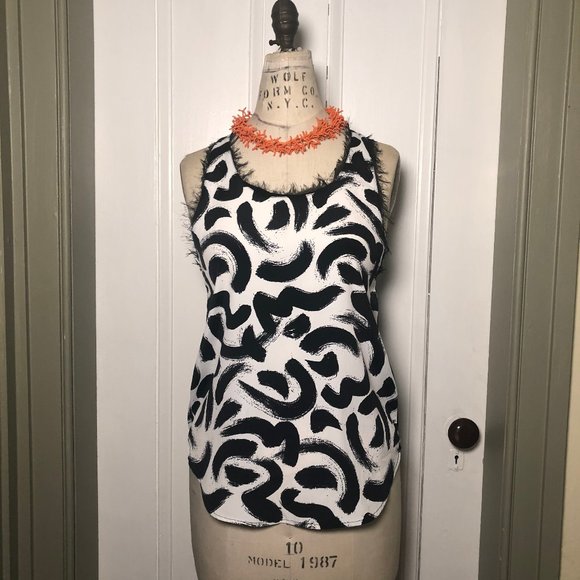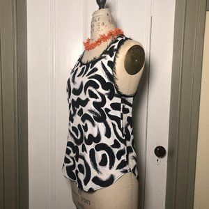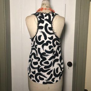 Size US 4 black and white brushstroke pattern tank top. Intentionally frayed edges around neck and arm holes. Tank is easy to dress up with a statement necklace (not included) for work or for a casual look. Fit is on the looser side. Great pre-owned condition, only worn 2 or 3 times. No trades.