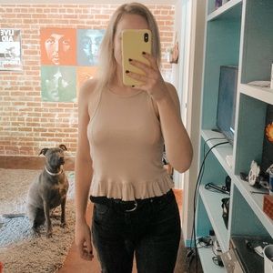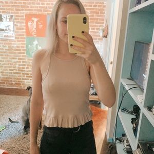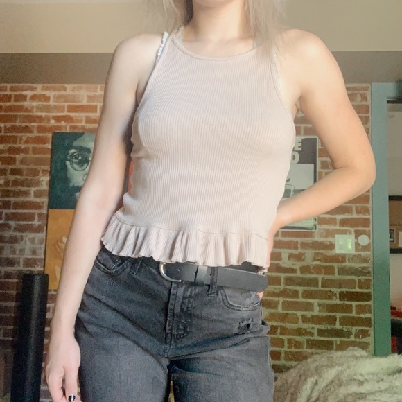 Light pink/nude color tank with ruffled bottom. Racerback style tank, looks great with a bralette under it for added detail. Lightly worn, no signs of use. Super stretchy and comfortable material.