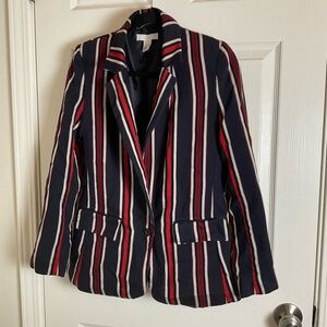 Elevate your style with this chic striped blazer. Featuring bold blue , red, and white stripes, front pockets, it's perfect for any occasion. Pair it with your favorite outfit for a sophisticated look. One button closure, Three button sleeve cuffs, Two extra buttons attached.