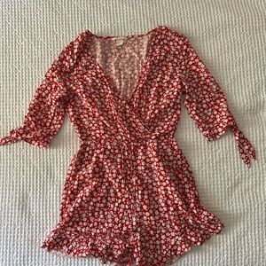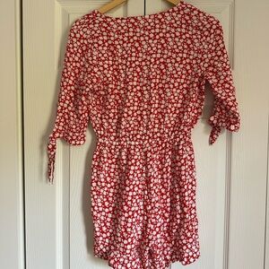 Chic red floral wrap romper with tie sleeves. Perfect for any occasion.
