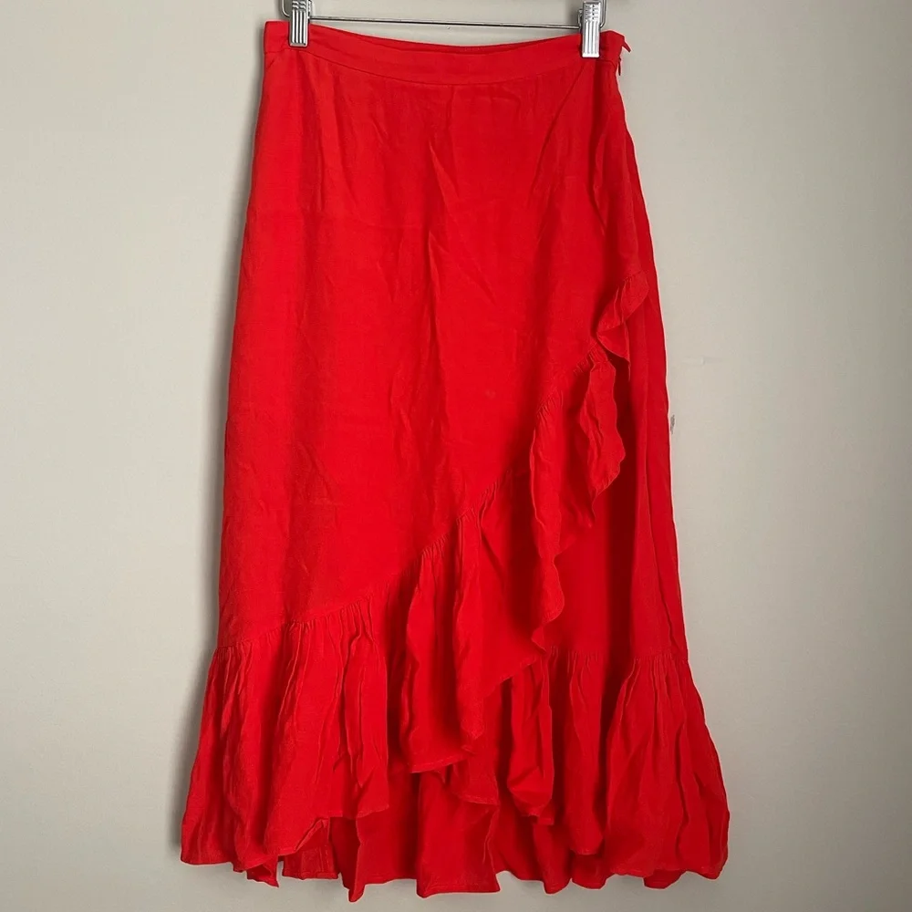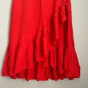 Vibrant red wrap-style skirt. High-low hem with cascading ruffles. Lightweight flowy fabric. Feminine and versatile.