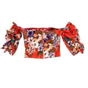 Gorgeous red floral off-the-shoulder blouse from H&M featuring dramatic puff sleeves, ruched bust, and a fitted silhouette.