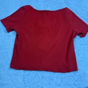 Chic red ribbed top with button-down front. Short sleeves and scoop neckline. Ideal for versatile styling.