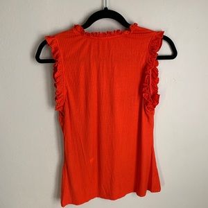 Ribbed red-orange tank with ruffle detail around the sleeves and neck. Very flattering stretchy fit.