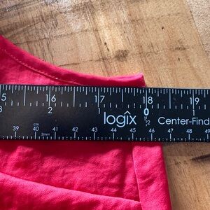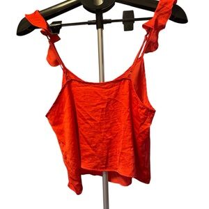 Bright red tank top from H&M featuring feminine ruffle shoulder straps and a relaxed, flowy fit. Lightweight woven fabric with adjustable-style thin straps beneath the ruffle detail. Easy to dress up or down — perfect for summer, date night, or layering under a cardigan.