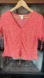 This vibrant red and white blouse from H&M features a stylish tie front and ruched detailing, perfect for adding a touch of elegance to your wardrobe. The short sleeves and notched collar enhance its chic appeal, making it a versatile choice for various occasions.