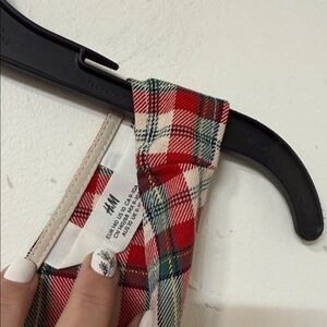 This H&M dress showcases a striking red and white plaid pattern, ideal for casual outings. Its sleeveless, boxy design ensures a comfortable and relaxed fit. The woven fabric and rounded neckline enhance its timeless style.