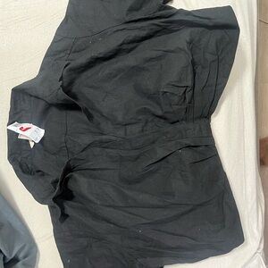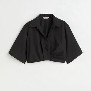 Crop blouse in woven fabric with a twisted effect at front of hem. Resort collar, concealed fastening at front, and yoke at back with pleats. Gently dropped shoulders and short, wide sleeves. Wide, covered elastic at back of hem. Unlined.