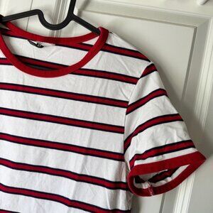 White short-sleeve t-shirt featuring classic red and navy blue stripes with a contrasting red ringer neck and cuffs. Soft cotton blend, relaxed fit. Perfect for a casual, retro-inspired look!