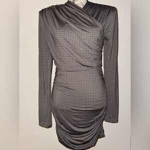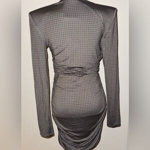 Short, fitted dress in stretch jersey embellished with sparkling rhinestones. Sewn wrapover front, shoulder pads, and long sleeves. Gathered seams at shoulders and sides for a draped effect.