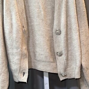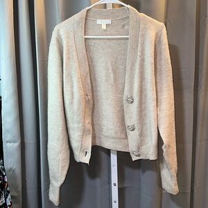 Short cardigan in a soft knit. Rhinestone-decorated buttons at front, gently dropped shoulders, and long sleeves. Ribbing at neckline, placket, cuffs, and hem.