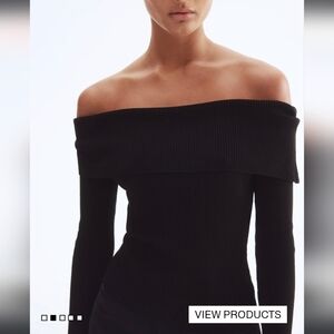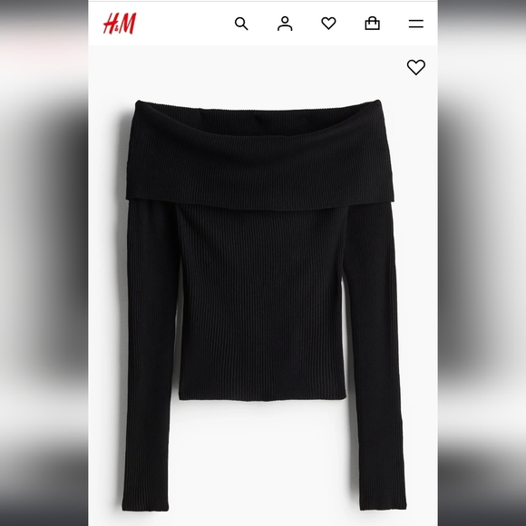H&M black ribbed off-shoulder sweater. Soft stretch knit with a wide fold-over neckline for a flattering silhouette. Long sleeves for cozy coverage. Versatile black color perfect for dressing up or down.