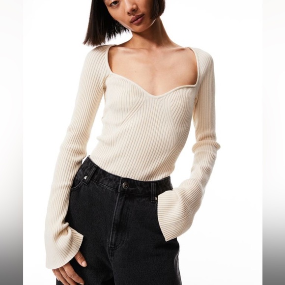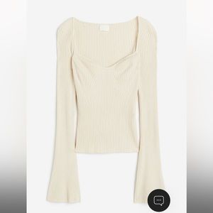 Cream colored sweater with a sweetheart neckline and long flared sleeves