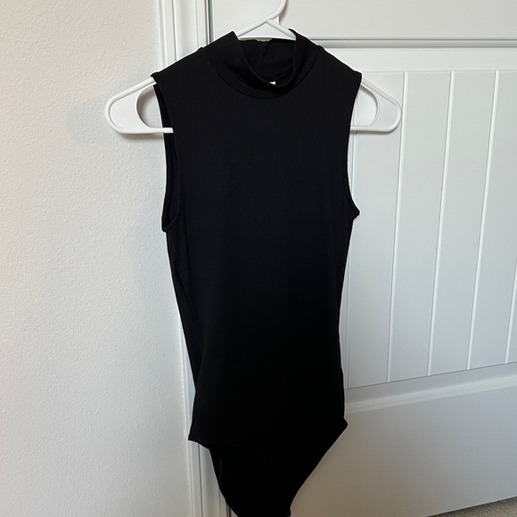 Stylish ribbed black top. Ideal for versatile styling. Mock neck.
