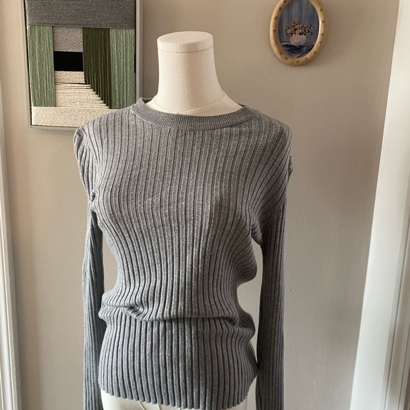 Size Medium. Chic gray ribbed sweater. Ideal for layering. Soft and comfortable.